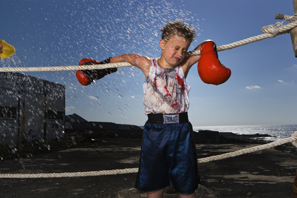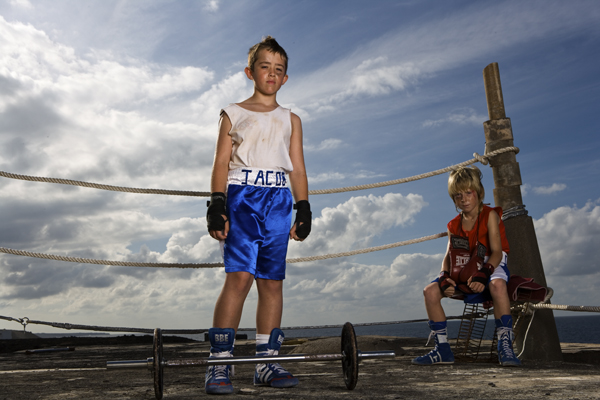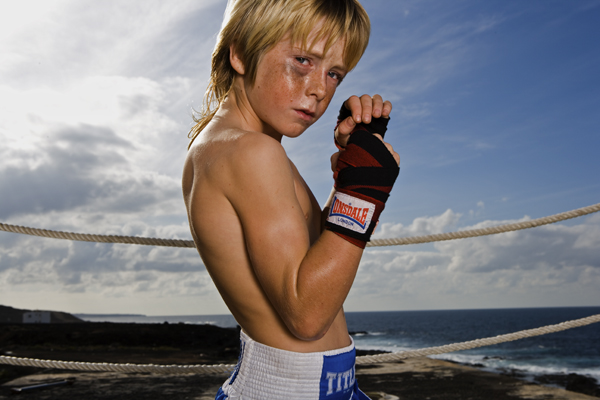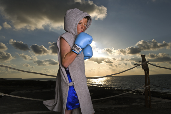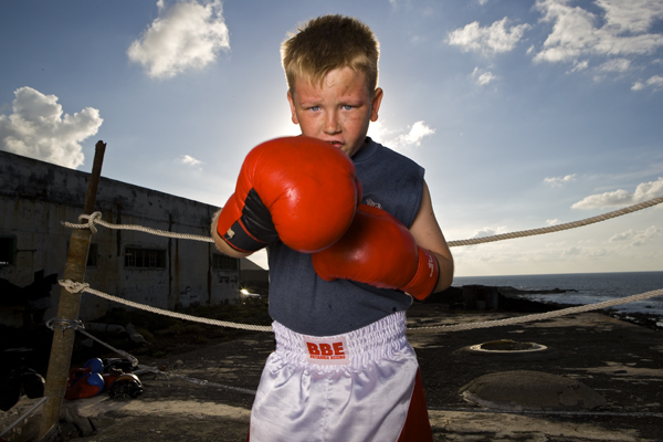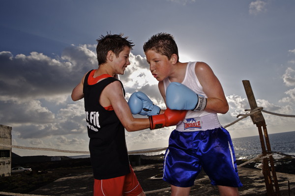 Wonderful pictures of boys boxing action unusually set against an outdoor, rugged background.